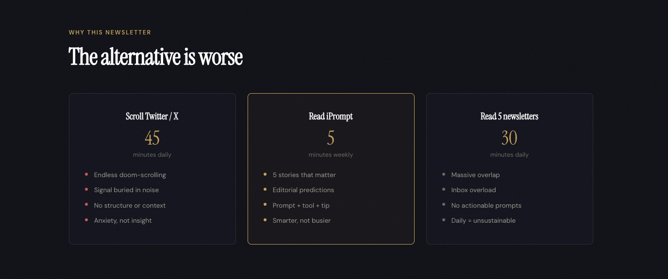 “I was subscribed to 6 AI newsletters. Now I just read iPrompt. Five minutes and I'm caught up."